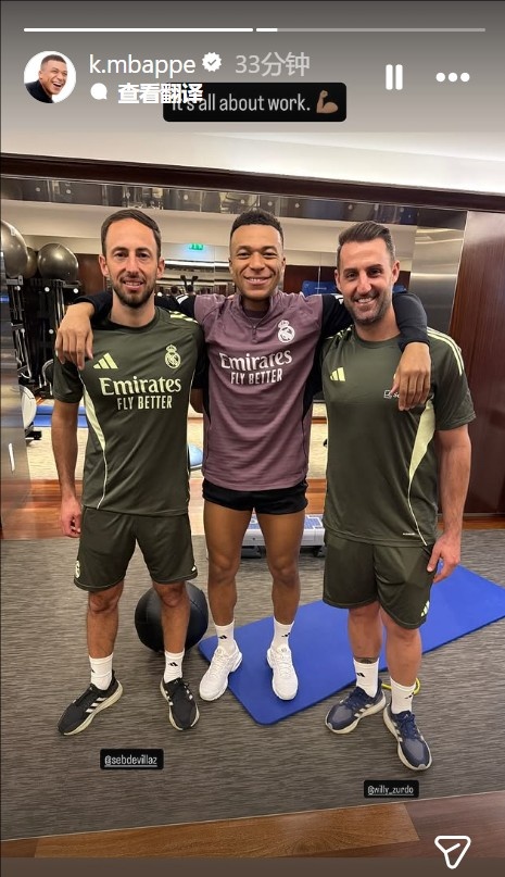 姆巴佩晒出了与皇马体能教练Sébastien Devillaz和理疗师Willy Zurdo的合照,配文写道:“一切全看努力。💪🏽”
